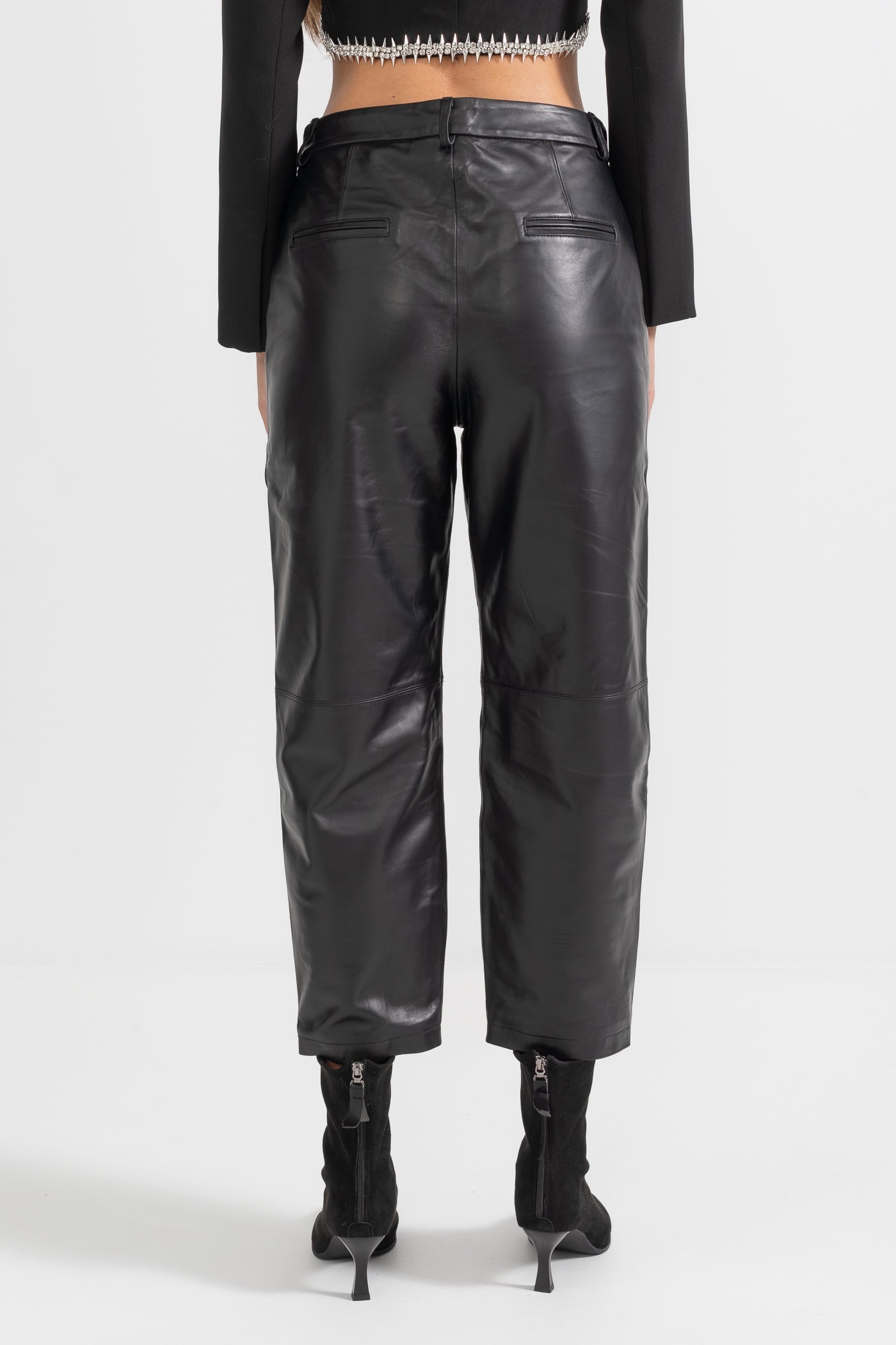 Calças de Couro Retas com Costura Decorativa - Preto
